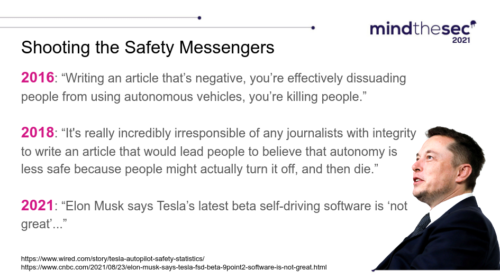 Tesla’s leadership also was waging ruthless war on anyone outside the government who dared to speak publicly about safety concerns. When journalists reported on Autopilot crashes, they were told they were “killing people” by undermining public confidence in autonomous vehicles. In 2018, critics were labeled “incredibly irresponsible” for writing articles that “would lead people to believe that autonomy is less safe because people might actually turn it off, and then die.”