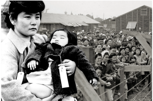Left: A Japanese-American woman holds her sleeping daughter as they prepare to leave their home for an internment camp in 1942. Right: Japanese-Americans interned at the Santa Anita Assembly Center at the Santa Anita racetrack near Los Angeles in 1942. (Library of Congress/Corbis/VCG via Getty Images/Foreign Policy illustration)