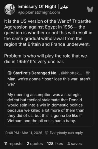 The EuroIntelligence assessment published today frames Trump’s three actual choices starkly: declare mission accomplished and leave (with the Strait still insecure), keep bombing as if the Strait will open (with no regime change), or conclude that the Strait is never safe while this regime exists and send in ground troops. They believe we’re in scenario two. The markets aren’t able to decide. But scenario two has a structural tendency to become scenario three, for the same reason Graziani’s advance to Sidi Barrani became Operation Compass became the Afrika Korps became El Alamein became the liberation of Sicily.