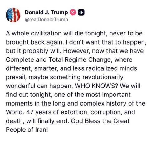 “A whole civilization will die tonight, never to be brought back again” is Trump’s statement of intent.