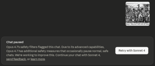 You would think some kind of record, or at least a ticket or token, would appear for reference to the harsh action Anthropic took without cause, but no. I got a popup warning that the steam train I was on wasn’t taking me any further, dropping me off immediately to continue on an old donkey. The donkey said it knows nothing.