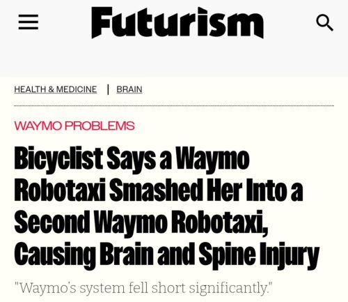 After all, bicyclists are the top business threat to the company. Anyone who knows how to ride a bike, and hasn’t yet been murdered by Waymo “normal practice”, isn’t likely to get in one to experience the murder of their fellow cyclists.