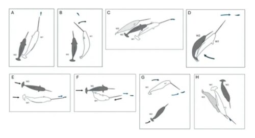 A series of narwhal and fish behaviors recorded during the course of an extended interaction between three narwhal and a single Arctic char in Creswell Bay, Somerset Island, Nunavut. The two larger, adult whales (W1, W3) had a similar mottled pattern that was lighter in overall color than the mottled pattern of the smaller subadult whale (W2). However, each whale is denoted by a label and distinct color for ease of continuity across the panel of diagrams. The fish is shaded in blue. Arrows denote movements of individual animals.